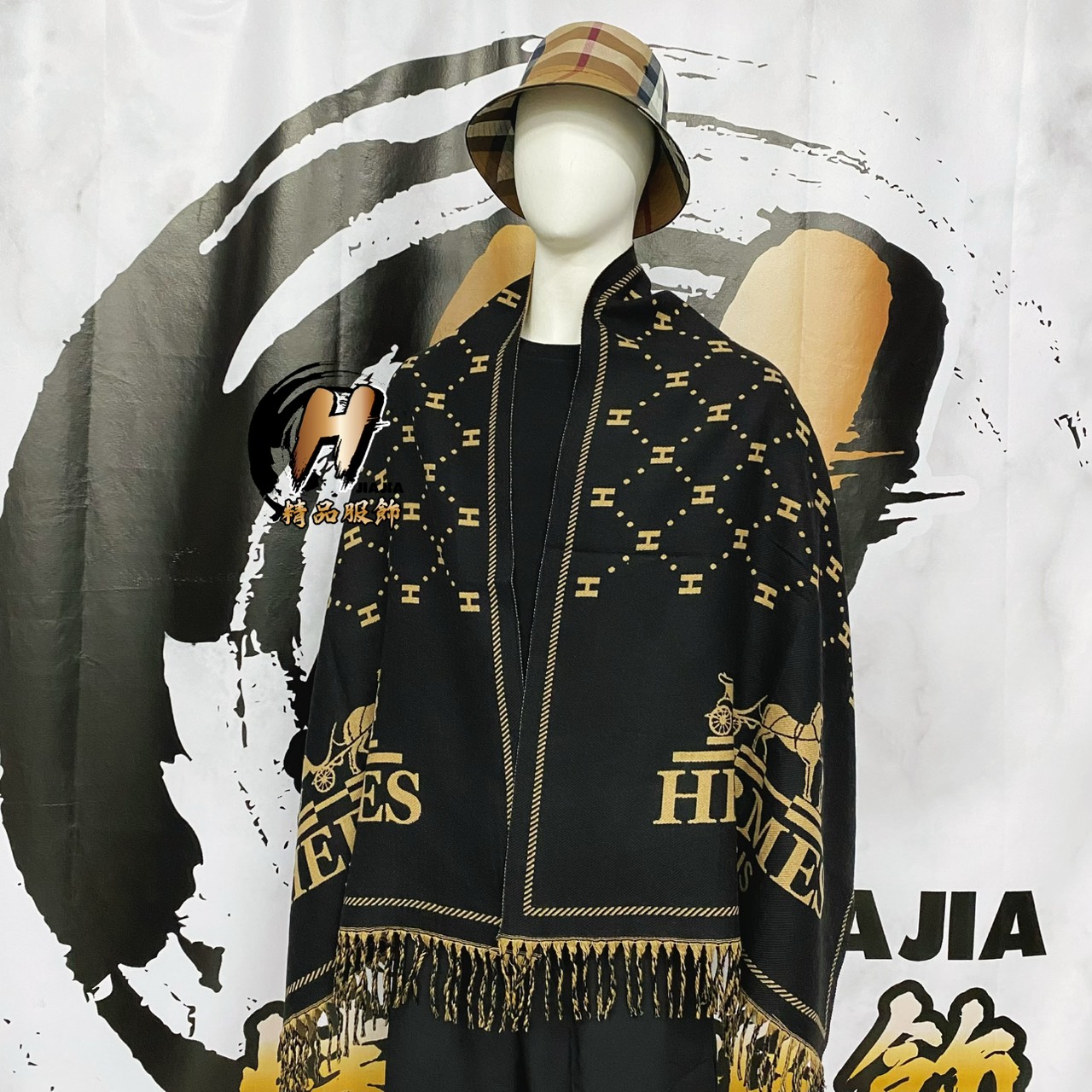 Hermes 愛馬仕 新款 經典滿版Logo 羊毛流蘇 黑黃 雙面 圍巾 披肩
