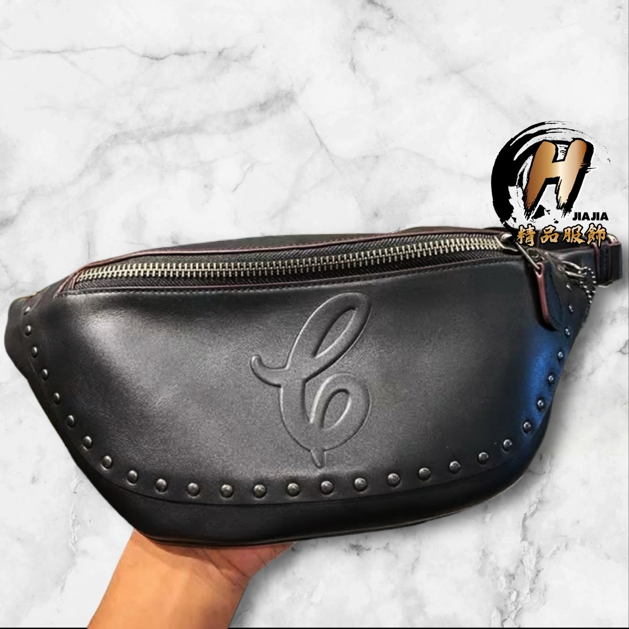 COACH 新款 經典Logo浮雕文字 鉚釘款 黑色 腰包 胸包