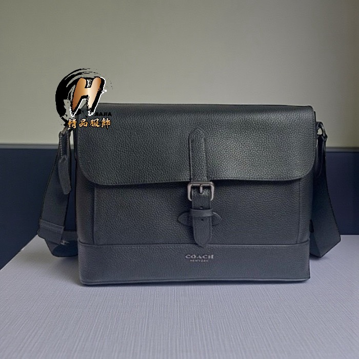 COACH 新款 HUDSON 經典立體Logo 牛皮荔枝紋掀蓋 黑色 郵差包 公事包