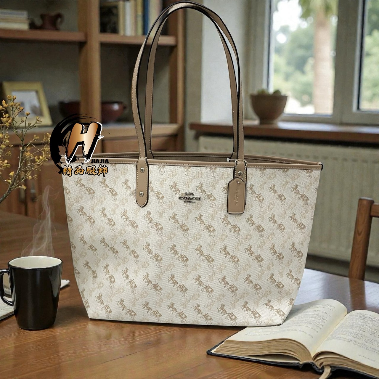 COACH 新款 滿版馬車Logo 防水防刮 奶茶白 手提托特包