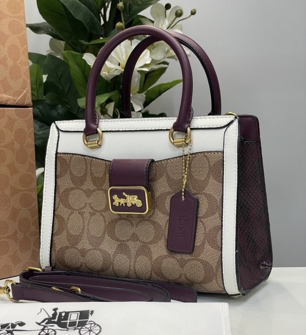 COACH 新款GRACE 馬車鐵牌 老花拼色款 咖啡白 手提包 斜背包