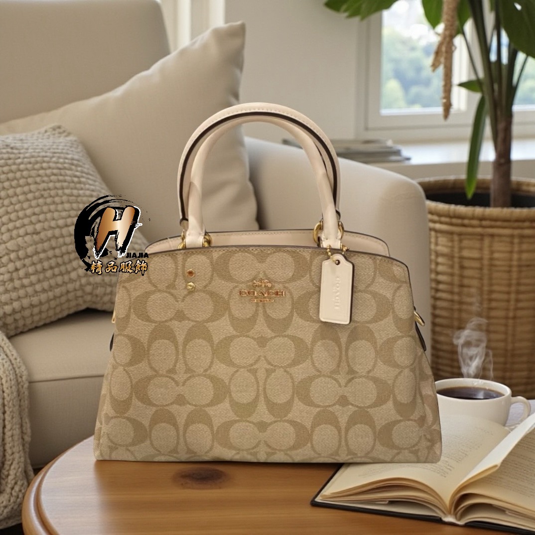 COACH 新款 Lillie系列 滿版老花雙層 卡其白 黛妃包 斜背包
