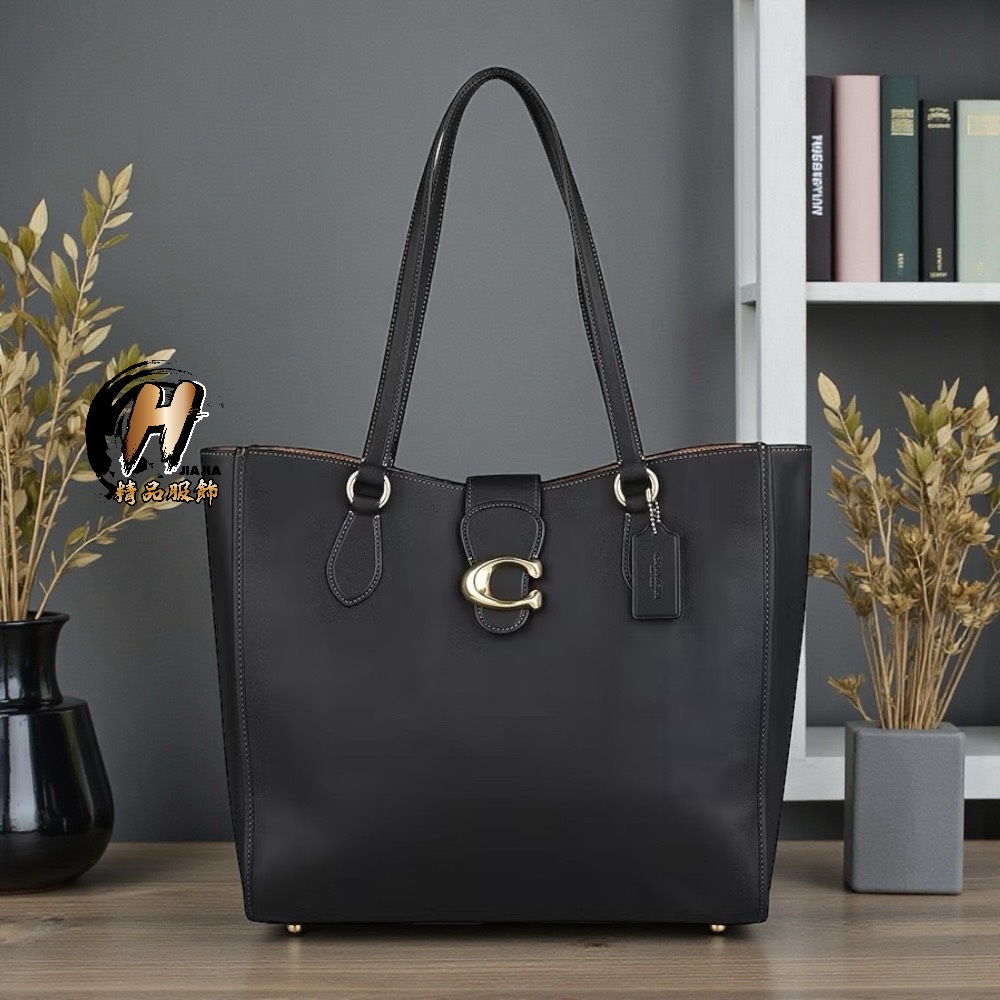 COACH 新款THEO光滑牛皮 立體C字扣 黑色托特包