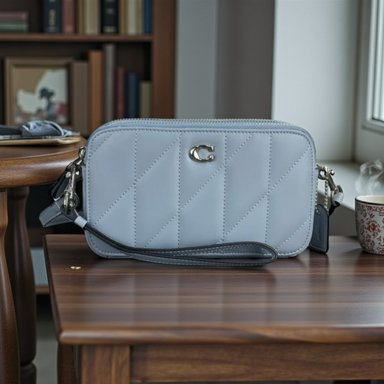 COACH KIRA 立體C字 小香風菱格紋 寶寶藍 方型拉鍊雙層手掛/斜背小包