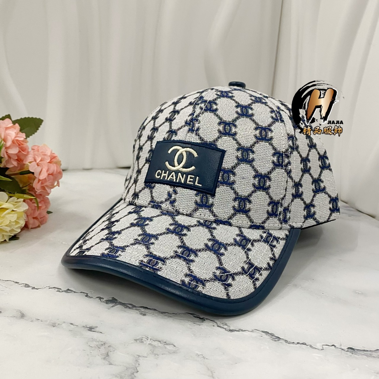 CHANEL 香奈兒 經典刺繡Logo  滿版老花 藍灰 鴨舌帽/棒球帽