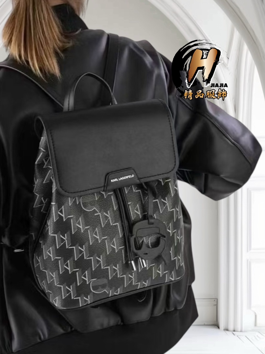 KARL LAGERFELD 專櫃最新款 卡爾 經典滿版Logo 老佛爺爺 黑色 後背包✅正品代購