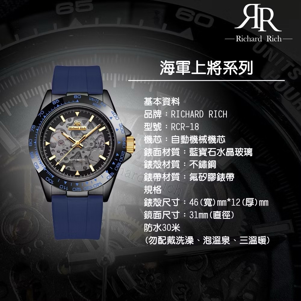 RICHARD RICH德國RR 海軍上將系列 黑湛藍 鏤空機械錶 腕錶✅正品代購
