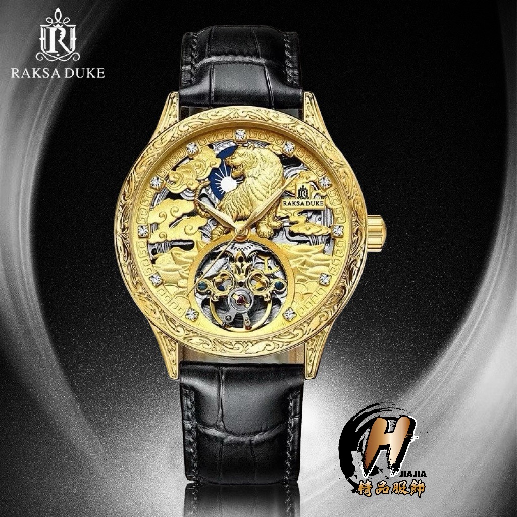 RAKSA DUKE羅薩公爵-立體浮雕雲虎 陀飛輪鏤空 金黑 機械錶 腕錶✅正品代購